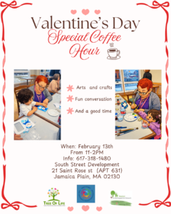 Join us this Friday, February 13th for a special coffee hour from 11am-2pm at South Street Development. Come do some arts & crafts, have great conversations, and enjoy some coffee. See flyer below.