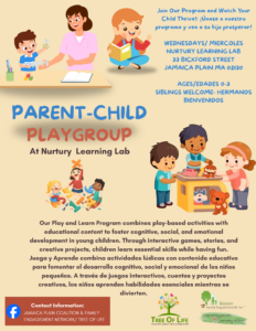Come join our weekly parent-child playgroups at Nurtury Learning Lab (33 Bickford Street, Jamaica Plain) every Wednesday from 12-1pm. Playgroups are for ages 0-3 and siblings are welcome as well. Come learn, play, and thrive with your children! Playgroups are in English and Spanish.
